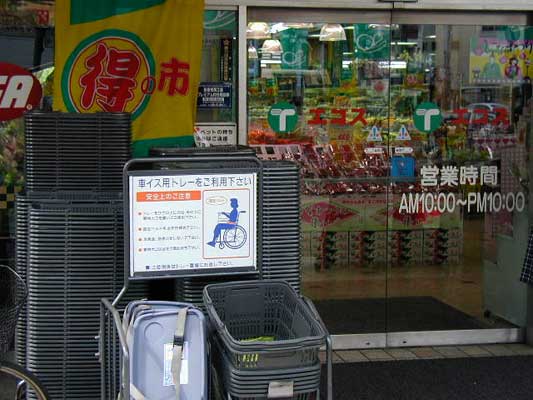 志木駅から立教大学新座キャンパスへの通学路の途中のスーパーで見つけた、ちょっとした気遣い。入り口の買い物かごの横に設置された車いす利用者のための買い物トレー。