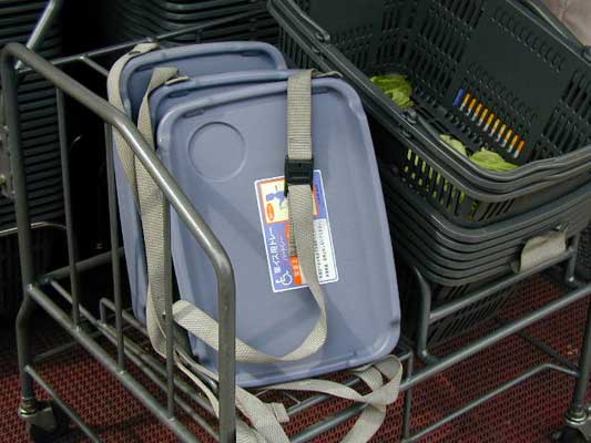 車いすでの移動時には両腕を使用する場合が多いため買い物かごを持ちながらの移動は難しい。そこでひざの上にトレーをおいて買い物をしてもらうという試みのように思われるゴムひもを付けることによってトレイのずれを抑える工夫がしているように思われる。