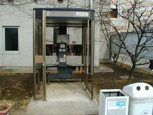 車いす利用者用公衆電話。 押しボタンで電話ボックスの扉が開くようになっている。 街中では現在のところあまり見かける機会はないがどの位の台数が現在設置されているのだろうか、写真のとおり設置にはかなりのスペースが必要となるため現状では設置台数が少ないように思われる。