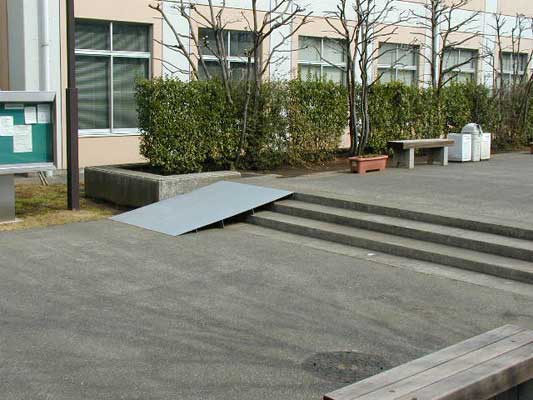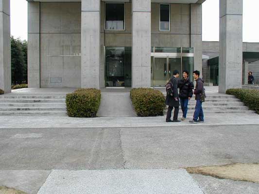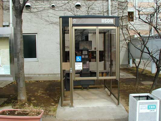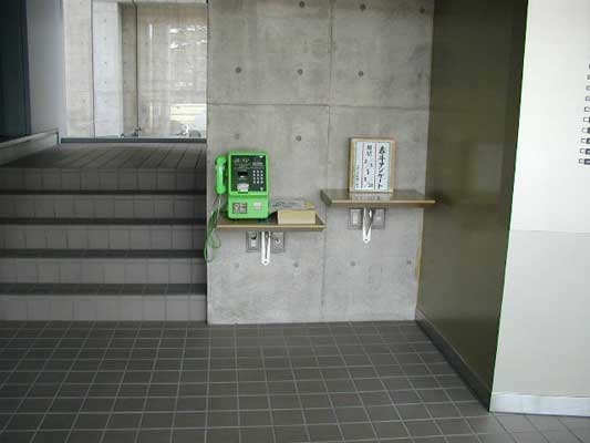 車いす利用者用公衆電話。 押しボタンで電話ボックスの扉が開くようになっている。 街中では現在のところあまり見かける機会はないがどの位の台数が現在設置されているのだろうか、写真のとおり設置にはかなりのスペースが必要となるため現状では設置台数が少ないように思われる。 研究棟の入り口に設置されている公衆電話も、高さは車いす利用者を考慮していると思われる。 キャンパス内の風景。スロープがいろいろな場所に設置されており、キャンパス内を自由に動くことができる配慮がされているように見える。 活動レポート集に戻る