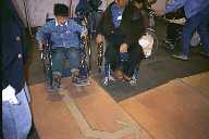 ←坂道の初めは段差になっているので、真っ直ぐ進むだけでは上る事が出来ない。よって、体験者が自分で上れない場合は、補助者が車いすの後ろに出ている棒を踏んで、前輪を持ち上げる。